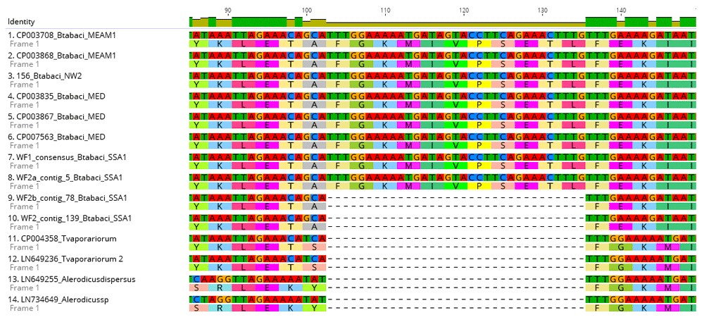 We report the presence of the primary endosymbionts P. aleyrodidarum and several secondary endosymbionts within SSA1 transcriptome. Furthermore, P. aleyrodidarum in SSA1 B. tabaci was observed to have a deletion of 11 amino acids on the NusG gene that is associated with cellular transcriptional processes within another bacteria species. On the other hand, P. aleyrodidarum from NW2, MED and SSA1 (WF2a, WF1) B. tabaci species did not have this deletion (Figure 1). The deleted 11 amino acids were identified in a loop region of the N-terminal domain of NusG protein, resulting in a shortened loop in the SSA1 WF2b sample. This loop region has high variability in both structure and length across bacterial species, and is absent from archaea and eukaryotic species.