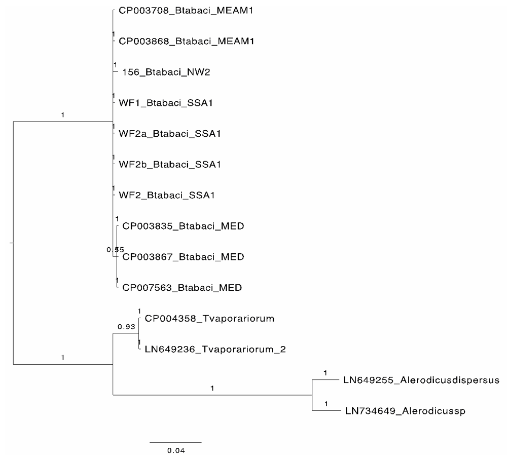 Nucleotide and amino acid sequence alignments of the NusG in P. aleyrodidarum were conducted for several whitefly species including: B. tabaci (SSA1, Mediterranean (MED) and Middle East Asia Minor 1 (MEAM1) New World 2 (NW2), T. vaporariorum (Greenhouse whitefly) and Alerodicus dispersus. The alignment identified 11 missing amino acids in the NusG sequences for the SSA1 B. tabaci samples: WF2 and WF2b, T. vaporariorum (Greenhouse whitefly) and Alerodicus disperses. However, all 11 amino acids were present in samples WF1 and WF2a, MED, MEAM1 and NW2 (Figure 1). Bayesian phylogenetic relationships of the NusG sequences of P. aleyrodidarum for the different whitefly species clustered all four SSA1 B. tabaci (WF1, WF2, WF2a and WF2b) within a single clade together with ancestral B. tabaci from GenBank (Figure 2). The SSA1 clade was supported by posterior probabilities of 1 with T. vaporariorum and Alerodicus, which formed clades at the base of the phylogenetic tree (Figure 2).