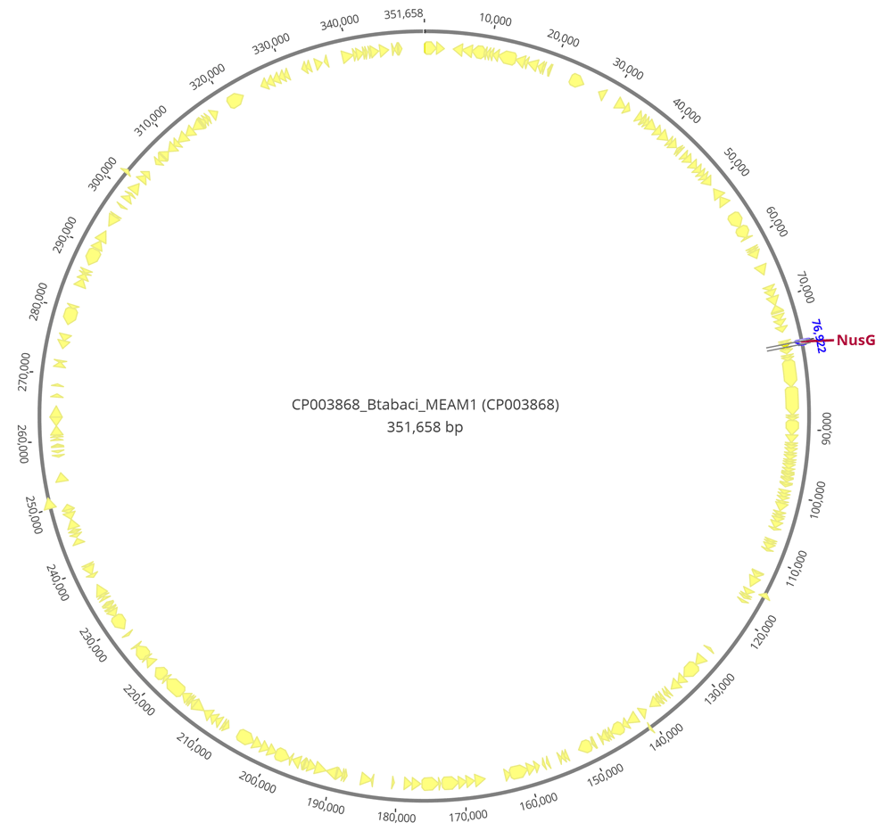 Viral-vector interactions within B. tabaci are further influenced by bacterial endosymbionts forming a tripartite interaction. B. tabaci has one of the highest numbers of endosymbiont bacterial infections with eight different vertically transmitted bacteria reported13–16. They are classified into two categories; primary (P) and secondary (S) endosymbionts, many of which are in specialised cells called bacteriocytes, while a few are also found scattered throughout the whitefly body. A single obligate P-symbiont P. aleyrodidarum is systematically found in all B. tabaci individuals. Portiera has a long co-evolutionary history with all members of the Aleyrodinae subfamily15. In this study, we further explore genes within the P. aleyrodidarum retrieved from individual whitefly transcriptomes, including the transcription termination/antitermination protein NusG. NusG is a highly conserved protein regulator that suppresses RNA polymerase, pausing and increasing the elongation rate17,18. However, its importance within gene regulation is species specific; in Staphylococcus aureus it is dispensable19,20.