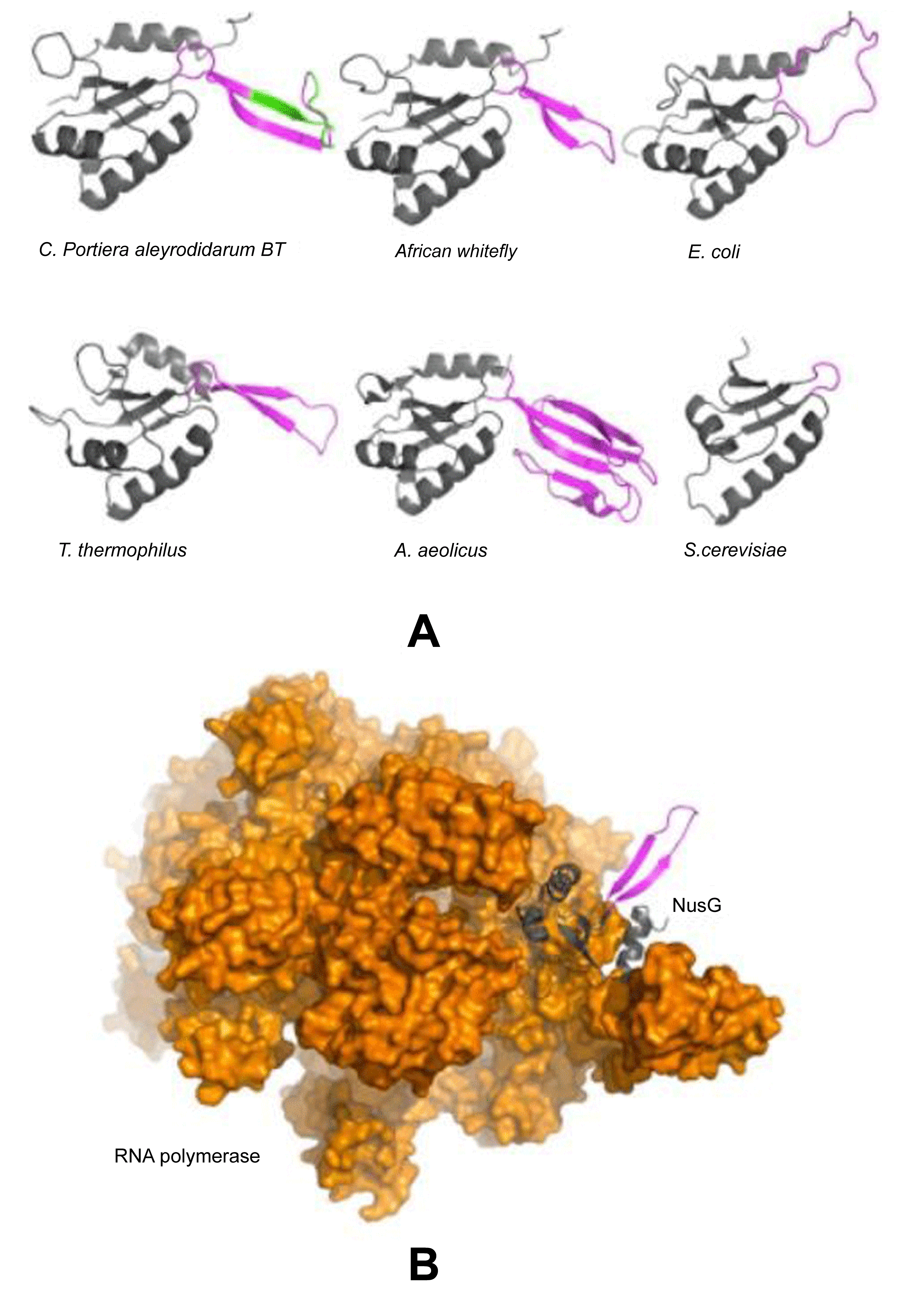 Structure analysis of NusG from P. aleyrodidarum in B. tabaci and other endosymbionts A. Phyre2 based structure prediction of NusG from Candidatus Portiera aleyrodidarum in B. tabaci SSAI whitefly and comparisons to the structures of NusG from other bacterial species as indicated and of Spt4/5 from yeast. NusG is coloured in grey, the loop region in magenta and the 11-residue deletion is shown in green in the C. Portiera aleyrodidarum structure. B. A model of bacterial RNA polymerase (orange surface representation) bound to the N-terminal domain of the T. thermophiles NusG (grey cartoon representation).