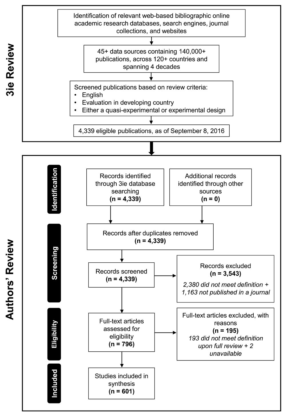 Importantly, although the repository includes impact evaluations published in any form, our inclusion criteria for this review required a study to be published in a scientific journal. Therefore, only those publications moved on to Stage 3.