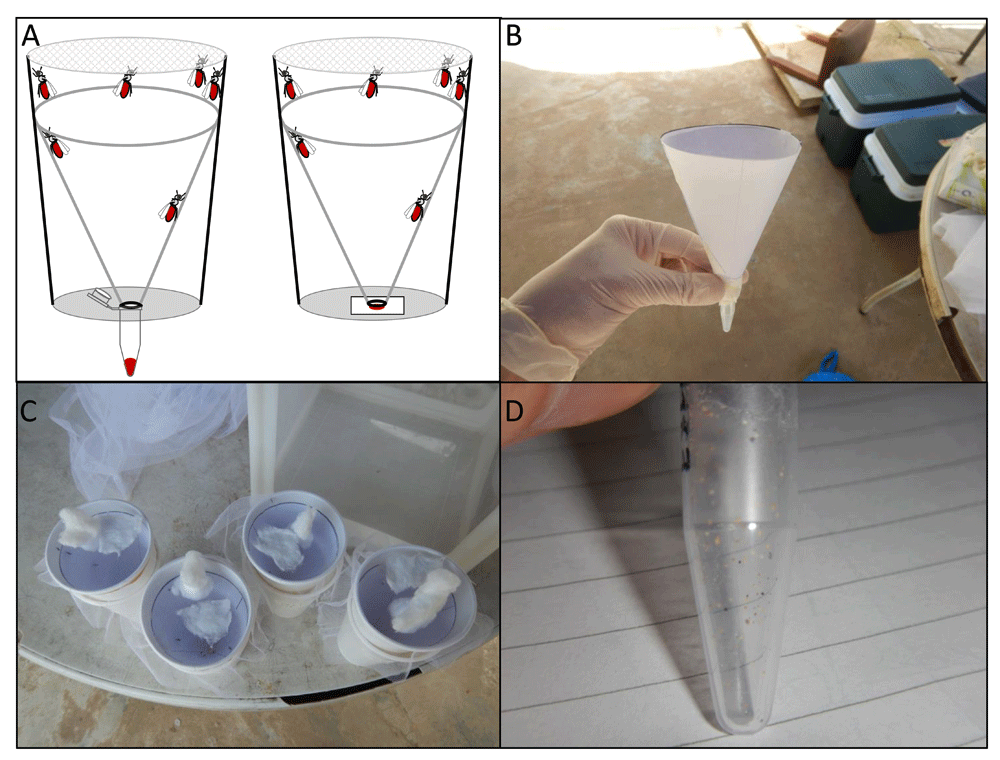 (A) Schematic of the collection cups with the superhydrophobic cone used to collect excreta/feces (E/F) into a tube (left) or onto FTA card (right). From the field site - (B) the superhydrophobic cone being assembled, (C) wild-caught mosquitoes in the collection cups with superhydrophobic cones, (D) the resultant E/F in a collection tube.
