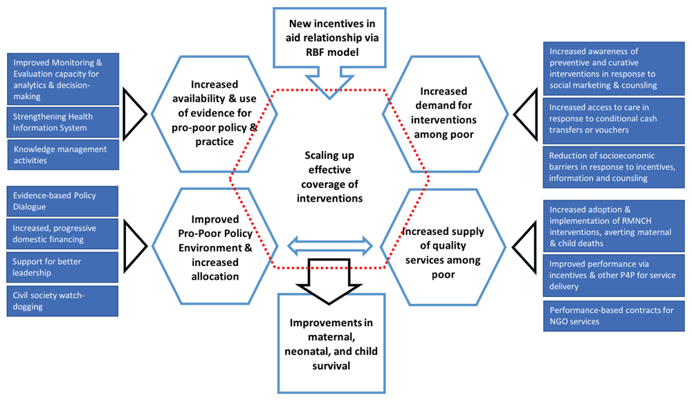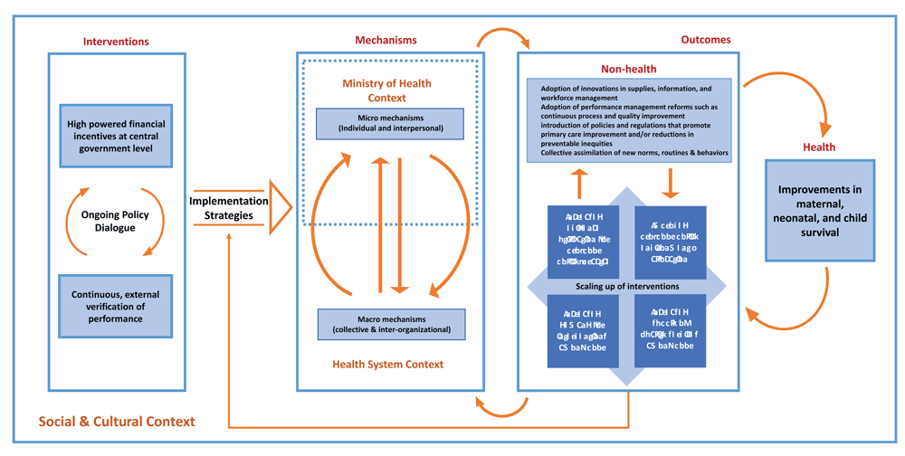 ➢ The use of (1) high-powered, supply-side financial incentives aimed at central-level government actors and stakeholders (intervention 1) and the implementation of continuous, external evaluation and verification of primary care service performance (intervention 2) supports country priorities through continuous policy dialogue, technical support, and purposive dissemination of performance results (implementation strategy);