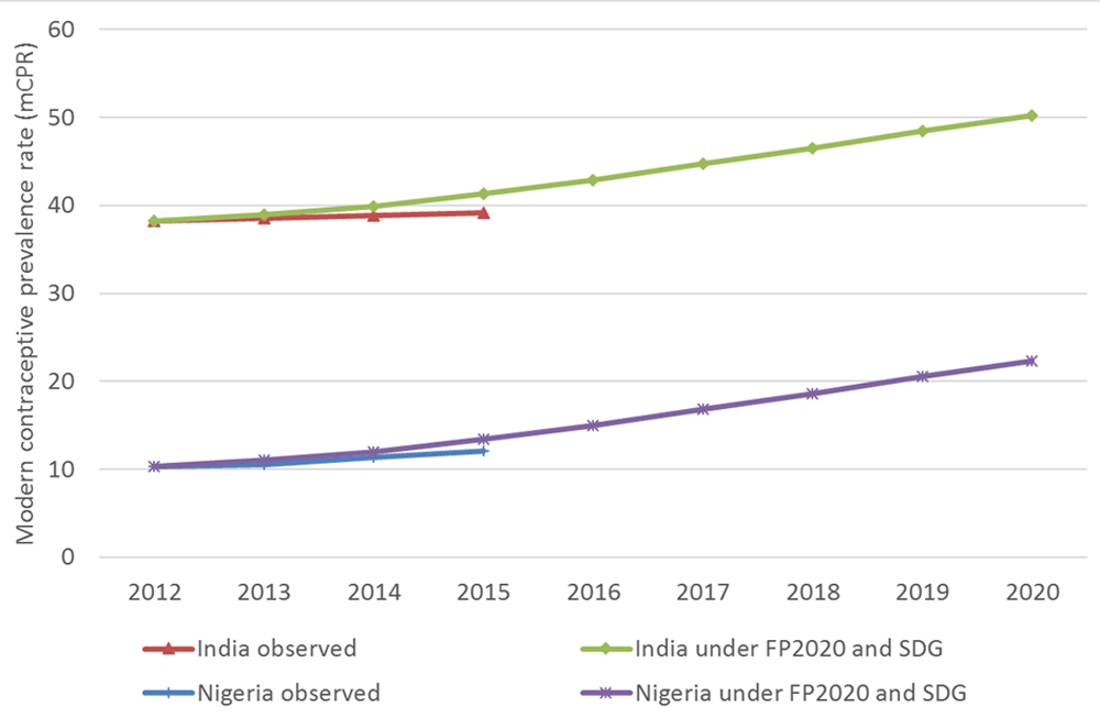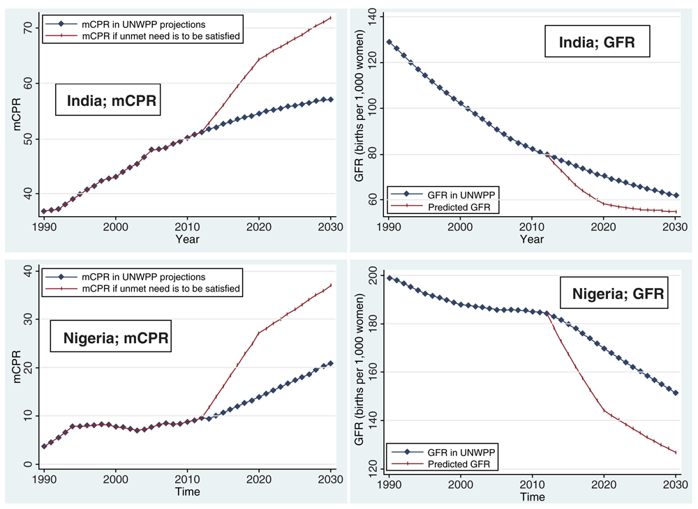 This study’s objective is to estimate the fertility changes and associated economic benefits that would result from reaching the target of the FP2020 Initiative, using India and Nigeria as case studies. Those countries were chosen since they are respectively the most population Asian and African country under the FP2020 Initiative, and they have the required data for this study. The forecasting effort is aligned with multiple targets in the Sustainable Development Goals (SDGs) adopted by the United Nations in September 2015. For example, Target 3.7 proposes that “By 2030, ensure universal access to sexual and reproductive health-care service, including for family planning.”14 Another target, under gender goal, states that “Ensure universal access to sexual and reproductive health and reproductive rights.”14