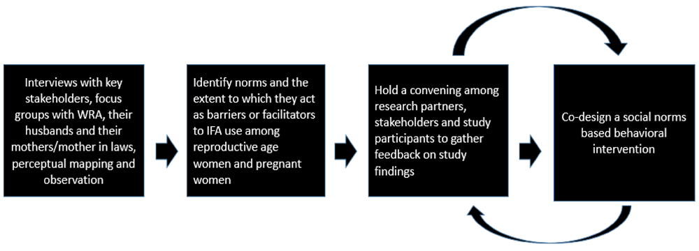 Qualitative inquiry can improve the description and explanation of complex, real-world phenomena related to attitude and behavior change. Quantitative research alone is often insufficient to understand these complicated processes52,53. Our research team proposes to examine why IFA supplement use is low despite recommendations from the government and existing programs promoting its uptake and which existing social norms promote or hamper uptake. Additionally, surveys and quantitative methods have been the primary tool to test theories on social norms and to understand the prevalence of existing norms in communities54,55. Some theorists have suggested that more qualitative research would be useful in illuminating the process of social norm change in different situations56. We respond to that call.