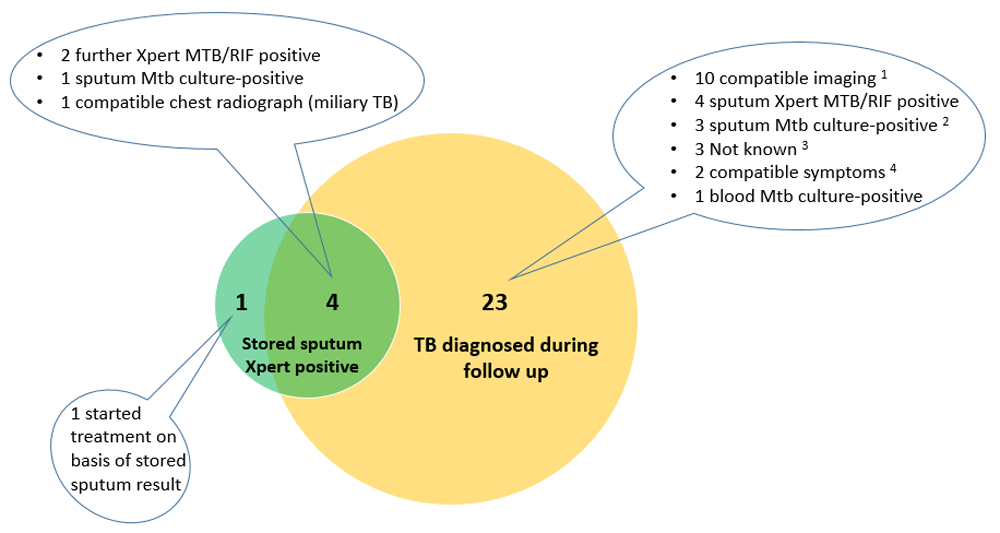1 Includes two participants for whom bacteriological confirmation was provided by stored sputum which was Xpert-positive; one of whom started treatment based on this result, and the other had already started TB treatment because of compatible chest radiograph (miliary TB).