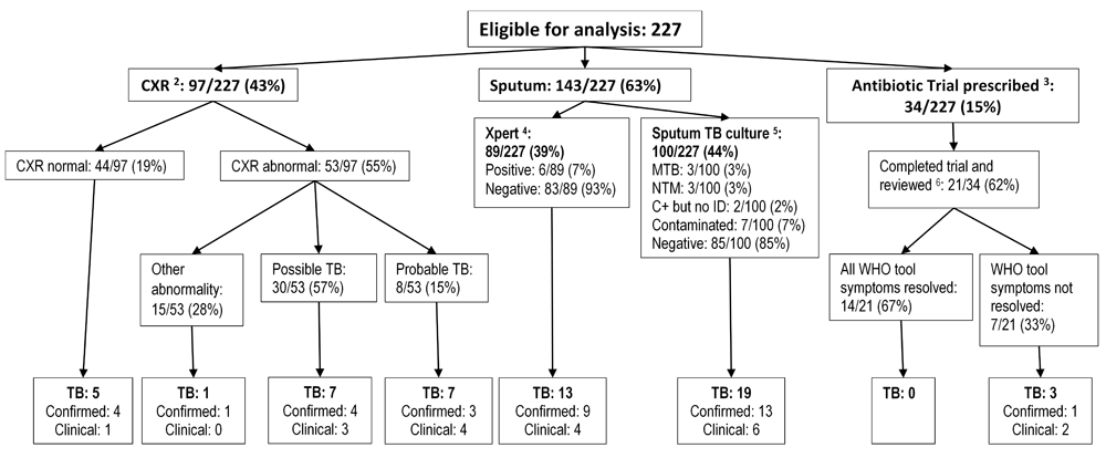 Figure 3 summarises all evaluations undertaken for TB during substudy follow-up, aside from 3-month visit mycobacterial cultures and Xpert on stored sputum samples. As part of routine care or facilitated by research staff for the Xpert-negative algorithm, 97/227 (43%) had a chest radiograph (38/97 [39%] fulfilled criteria for radiological TB), and 100/227 (44%) had mycobacterial culture on sputum (3/100 [3%] Mtb positive). 34/227 (15%) of participants were prescribed an antibiotic trial at the Xpert result review, and 14/21 (67%) of those reviewed reported resolution of symptoms.