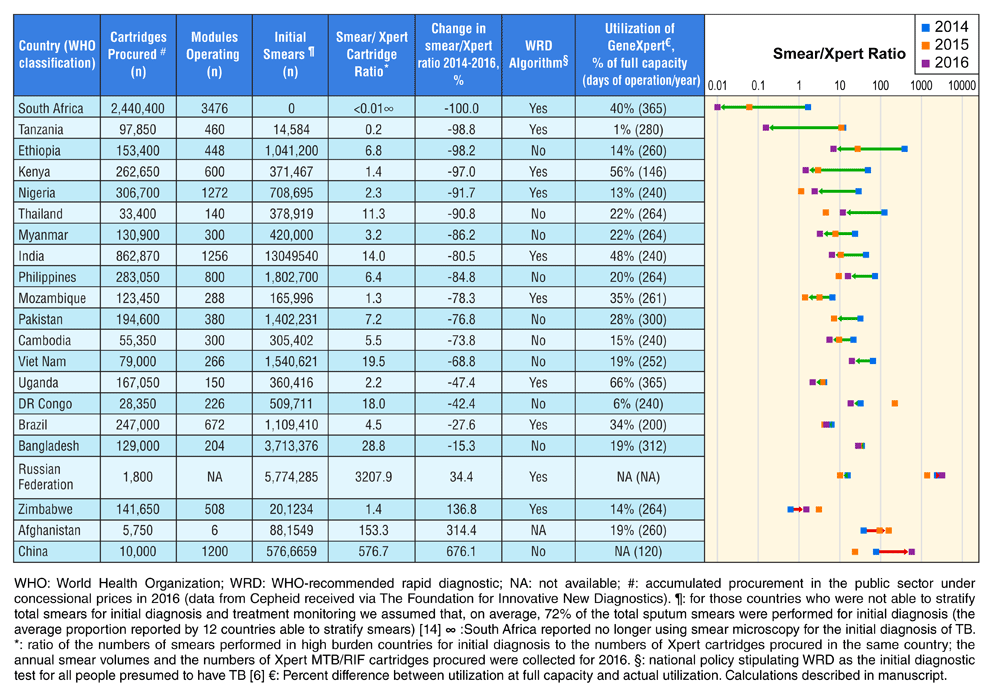 Overall, our data shows that high-burden countries have demonstrated a positive trend towards greater use of Xpert MTB/RIF. South Africa had the largest percent decrease in smear/Xpert ratio from 2014–2016, making it the leader in GeneXpert market penetration. This is underscored by the fact that South Africa did not report any smears for initial diagnosis of TB in 2016.
