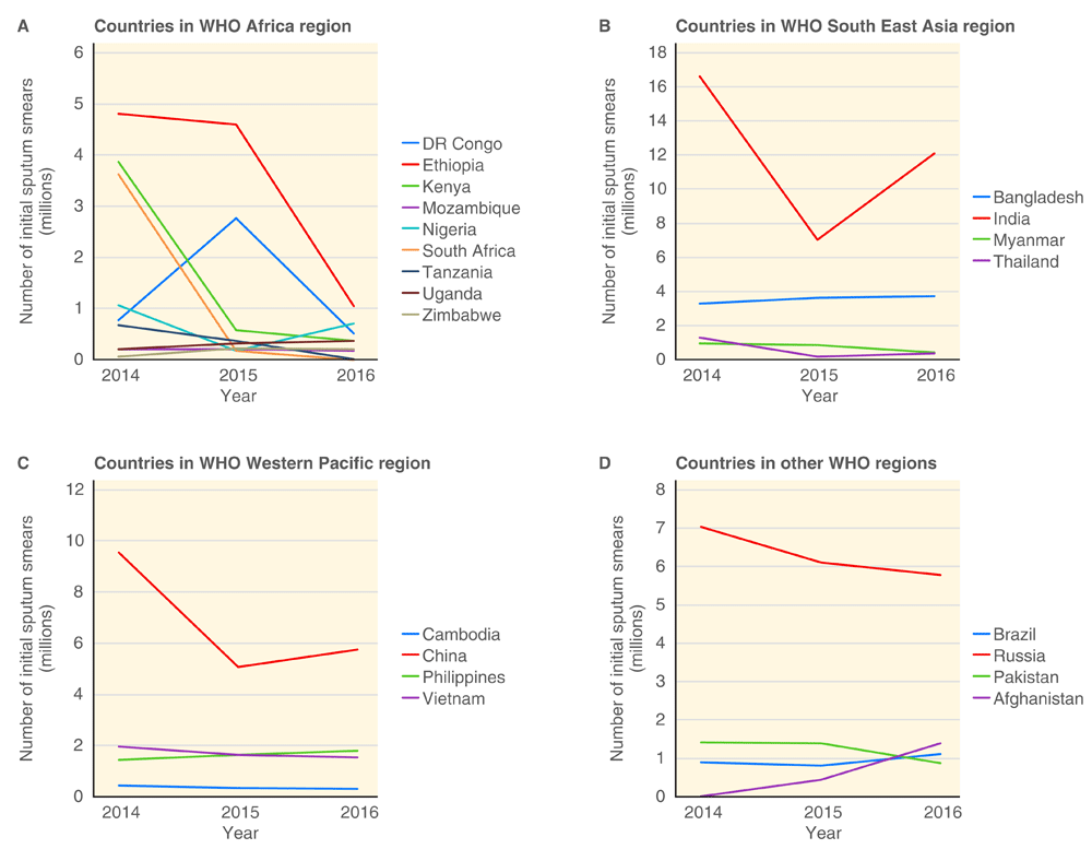 Most of the countries in the African region had a decline in initial smears (Figure 2), suggesting that Xpert MTB/RIF is replacing smears for the initial diagnosis of TB in most instances. In other regions, there is not much of a decline in the use of initial smears in certain countries. A possible explanation could be the use of GeneXpert in addition to smear for initial diagnosis, or only using it to test specific populations (e.g. those at risk for multi-drug resistant TB (MDR-TB)). Certain countries, such as India and the Democratic Republic of Congo, showed an overall decline in initial smears between 2014 and 2016, however there were large peaks in 2015. This could be due to variations in reporting from year to year.