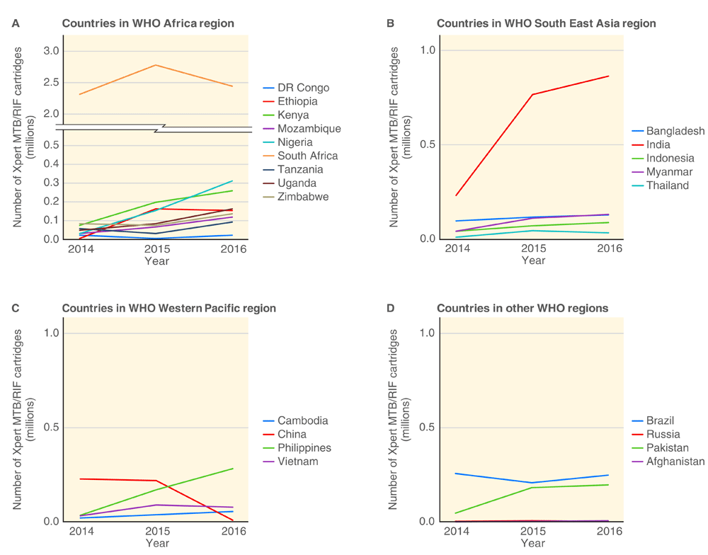 The WHO endorsed the Xpert® MTB/RIF assay (Cepheid, Sunnyvale, CA, USA) for TB in 2010. By the end of 2017, 34.4 million Xpert MTB/RIF had been procured in the public sector under concessional pricing1. Xpert Ultra, a test with a higher sensitivity than Xpert MTB/RIF, was released in 2017 and also endorsed by the WHO2.
