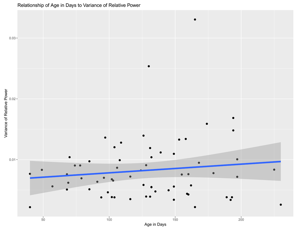 A logistic regression model was used to predict at-risk status among 32 infants (11 at-risk) with a mean age of 90 days. Variance of relative power was calculated as standard deviation of the 32 relative power measurements for each infant was used as the only predictor within the model. A test of the full model compared to a constant model was statistically significant, indicating that variance of relative power accurately classified at-risk status (chi square = 7.64, p < 0.01, df = 2, odds ratio = 1.18). Conversely, at-risk status significantly predicted variance of relative power (p < 0.01, F = 8.33, R2 = 0.217, df = 2). A designation of at-risk was associated with higher variance of relative power. Interestingly, as shown in Figure 1, age in days did not predict variance of relative power (p > 0.05).