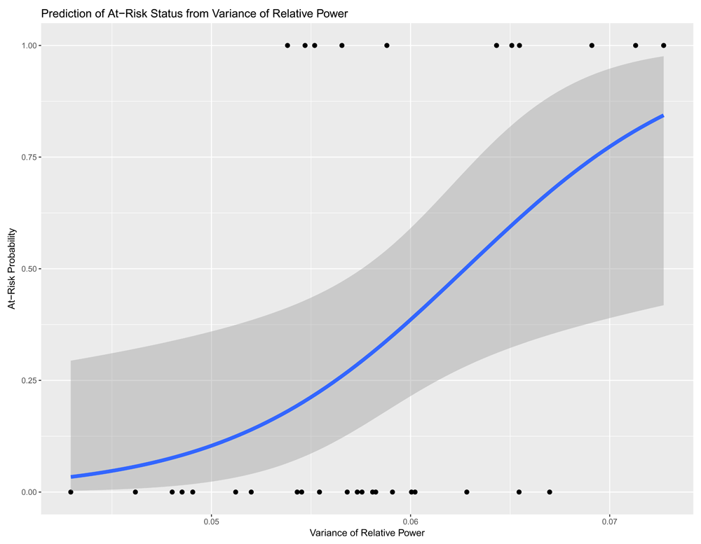 Leave-one-out cross-validation was performed using the identified logistic model to create a confusion matrix. Results demonstrated an overall accuracy of 75%, with a true negative rate of 86% (18/21) and a true positive rate of 55% (6/11). Results of the analysis demonstrated that an infant with higher variance of relative power across all EEG electrodes had a higher probability of being classified as AR (Figure 2).