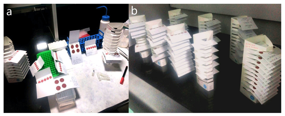 Finger prick blood DBS Preparation. Finger prick blood was collected using a lancet to puncture the fingertip. Once a full small drop of blood is formed it was lightly touched to the center of the circle on the filter paper (GE Health Care Life Science, Catalog no. 10534612) to form valid DBS. These were collected from study participants during health checkup organized at government schools, and at the center of villages. Cards were dried for 2 hours in velcro rack and packed in sealed ziplock bag with 1–2gm desiccant sachet (Figure 1). Only valid DBS samples were used for gDNA extraction determined by the blood sample completely saturating each circle on the card, and not overlapping or merging with other blood circles. Prepared DBS samples were transported to the laboratory at the Centre for Cancer Epidemiology, Tata Memorial Centre, where they were stored in a -80°C refrigerator.