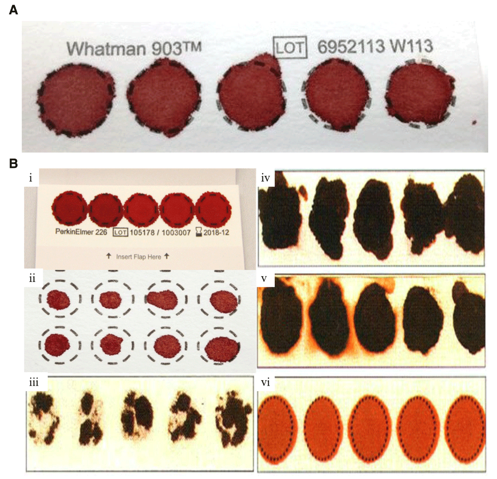 (A) Valid specimen. DBS with complete filled circle with proper air dry with no hemolyzed blood or serum ring. (B) Invalid DBS Specimen. (i) DBS with overlapping of spotted blood. (ii) DBS with insufficient filled blood. (iii) DBS with incomplete absorption which reduces blood volume. (iv) DBS that is potentially rubbed and develop scratches. (v) DBS with hemolyzed or contaminated blood. (vi) DBS with improper air drying before packaging in ziplock bags.