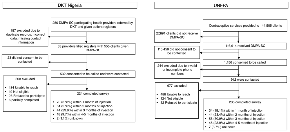 For private sector providers supplied by DKT Nigeria, DKT outreach personnel distributed a client register to each selected facility to collect potential survey participants. In two one-day sessions, DKT Nigeria outreach personnel were trained on explaining the purpose of the research to providers, instructing providers on how to complete the registers and seek consent for research from eligible clients. To maximize the number of potential respondents, only high-volume facilities were targeted for client register data collection. DKT Nigeria provided a list of 250 DMPA-SC participating providers, of which 187 were excluded due to duplicate records, incorrect data, and missing contact information. Of 63 providers who filled in information on the client registers, 555 clients received DMPA-SC and 532 consented to be contacted. We periodically contacted participating private providers (every 4–6 weeks) to extract information on eligible clients and their contact information from the registers. The sample size was one of convenience, and no attempt was made to control for bias during recruitment and enrollment.