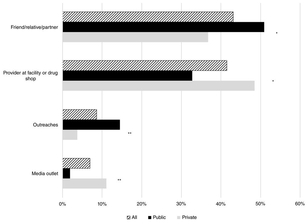 The source of awareness about DMPA-SC is displayed in Figure 2. Overall, 43.1% of respondents had heard of DMPA-SC through a friend or family member and 41.5% through a provider, followed by 14.6% at outreached in the community and 1.8% from a media source. Higher percentages of respondents attending public providers heard about DMPA-SC through a friend or family member and outreaches in the community (50.9% and 15.6%, respectively) compared to their private sector counterparts (36.8% and 3.7%, respectively). In contrast, higher percentages of respondents attending private providers heard about DMPA-SC directly from their provider or through different media outlets (48.5% and 11.0%, respectively) than among public sector respondents (32.7% and 1.8%, respectively).