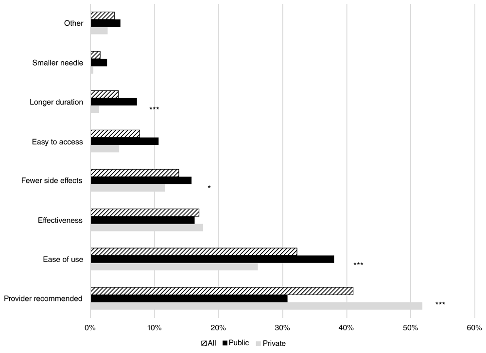 Providers’ recommendation was the most common reason given for choosing DMPA-SC (41.0% among all respondents), with more private sector respondents giving this reason (51.8%) than public sector respondents (30.8% Figure 4). Ease of use was also the reason for uptake among 32.2% of all respondents, followed by effectiveness (16.9%), potential for fewer side effects (13.8%), among others. More public sector respondents cited reasons related to specific DMPA-SC features than among private sector respondents: ease of use (38.0% and 26.1%, respectively), ease of access (10.7% and 4.5%, respectively), and longer duration (7.3% and 1.4%, respectively); no differences in responses were found for features related to side effects, effectiveness, or the smaller needle.