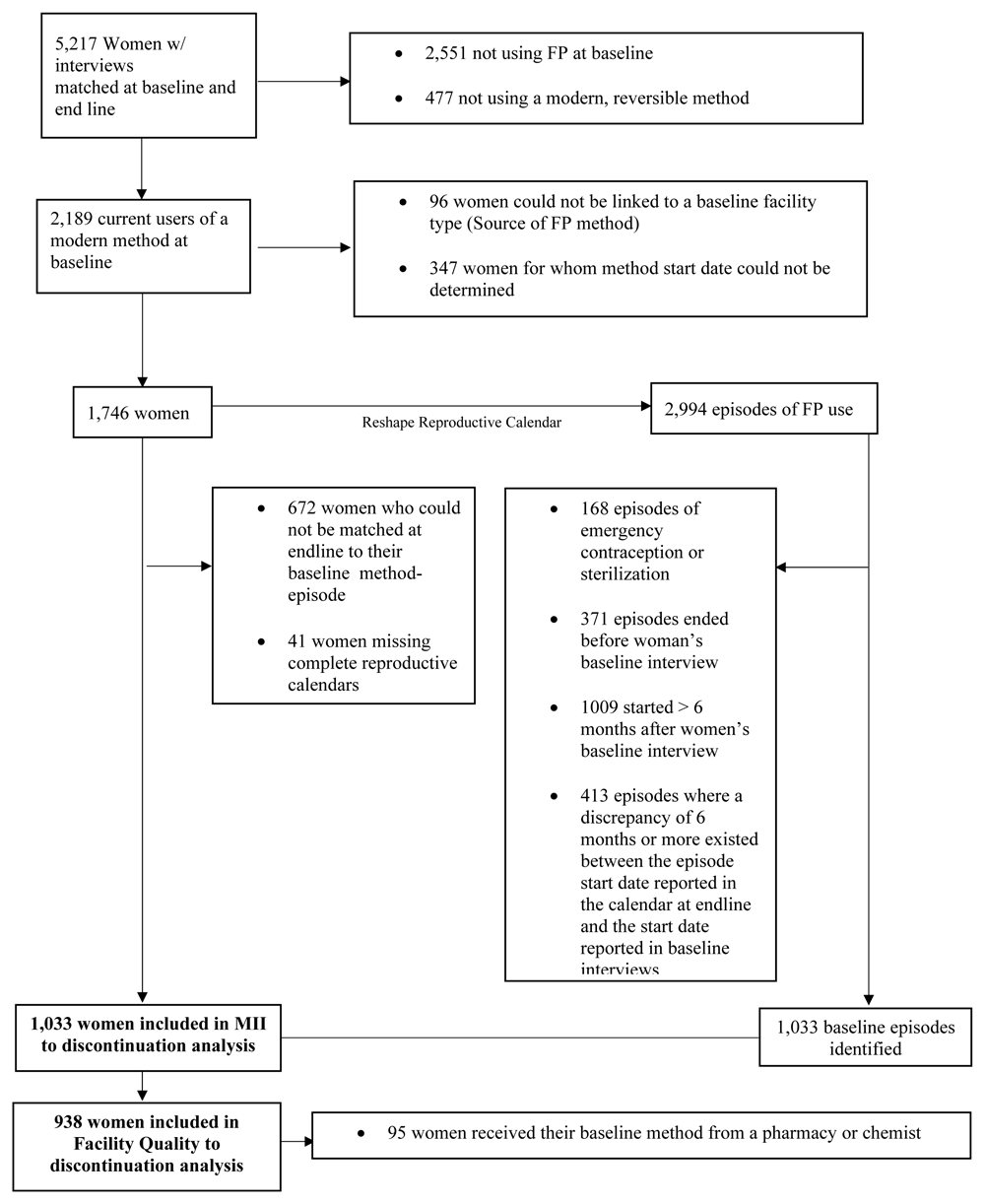1 Current users of family planning (FP) who were excluded from analysis if they matched any of the following criteria: 1) start date of baseline method could not be determined; 2) woman could not be linked to facility type as the source of her method at baseline; 3) complete reproductive calendar information was not available for the woman at end line; or 4) the woman’s baseline episode of contraceptive use could not be identified in her reproductive calendar within 6 months of the start date she reported at baseline.