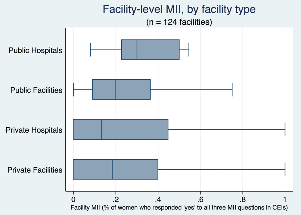 The distribution of women’s MII scores is presented at the bottom of Table 3. In baseline household interviews, 15.7% of the 1,033 women included in the MII to discontinuation analysis reported never having been informed of any the three elements of the MII in regard to their current method. More than half of the sample (55.5%) answered ‘Yes’ to all three questions. There were no significant differences in the distribution of MII scores (p = 0.26) or the frequency with which women answered yes to all three MII questions between the full analytical sample and the reduced sample used in the facility quality to discontinuation analysis (p = 0.33). Figure 2 presents overall facility-level MII, by facility type, for the 124 facilities included in analysis.