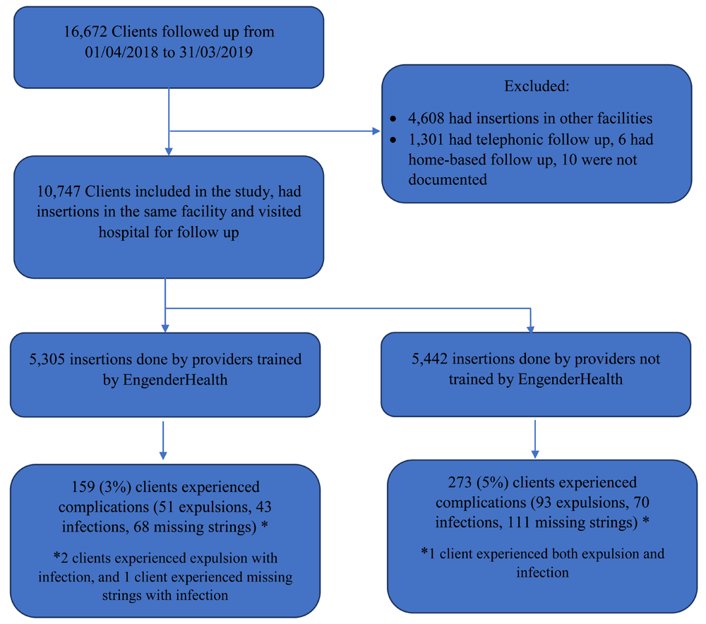 The unit of analysis was a client case that was confirmed through clinical follow-up to have experienced complication after IUD insertion. The presence of complication was described as presence of any one or more out of expulsion, infection, and missing strings. This variable served as a proxy indicator for the quality of IUD services14,15. For the analysis, the data were disaggregated according to whether clients had received IUD insertions from providers trained by EngenderHealth versus clients that received IUD insertions from providers that were not trained by EngenderHealth. The latter group included providers that were not formally trained in IUD insertions or had been trained by other institutions.