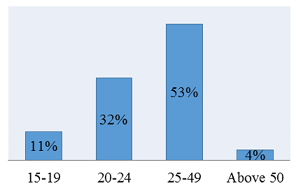Nearly half (43%) of the DMPA-SC clients were adolescents and young women below the age of 25. Figure 3 shows DMPA clients by age distribution.