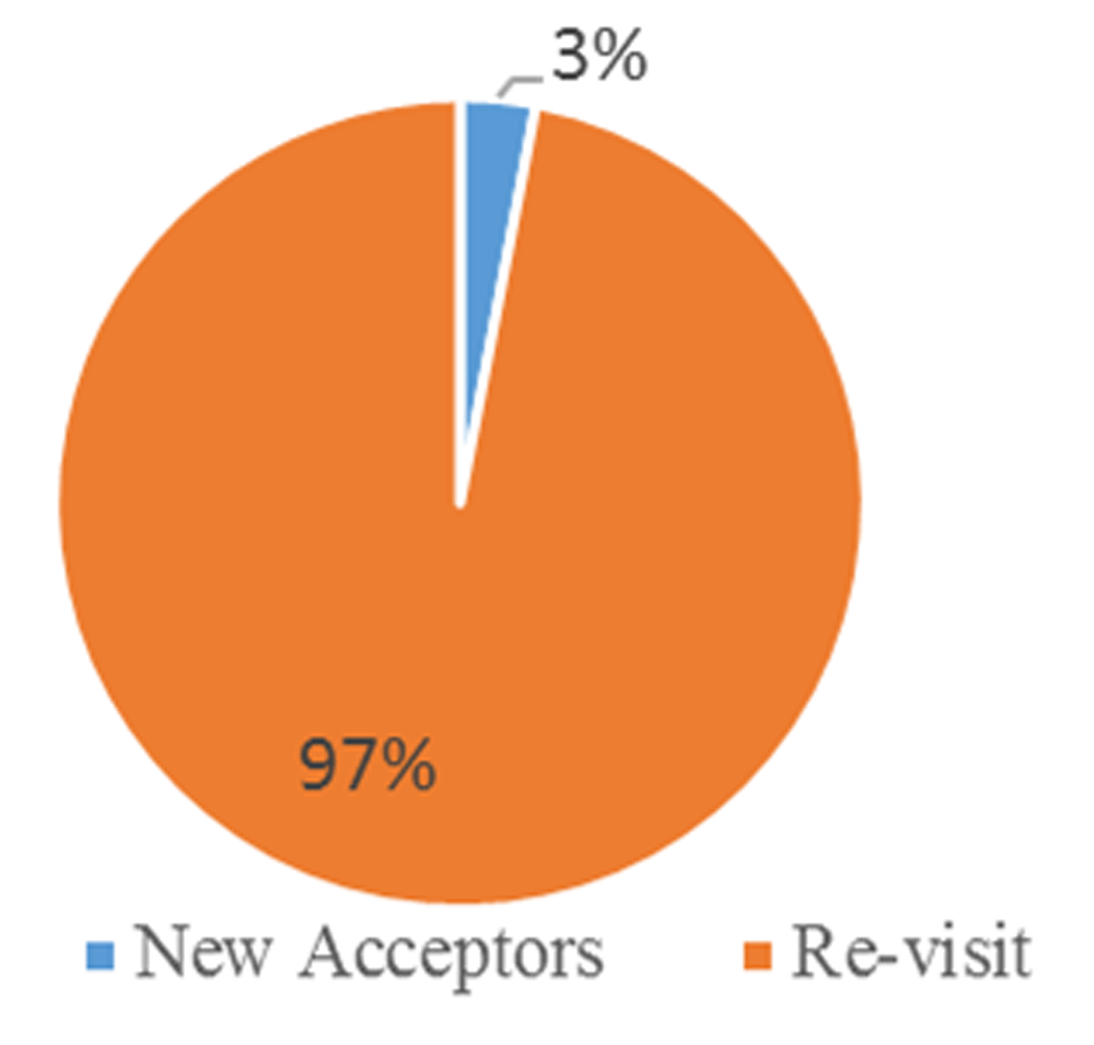 The Majority of DMPA-SC clients (about 97%) were revisits on FP, while only 3% of DMPA-SC users were new acceptors, as indicated inn Figure 4.