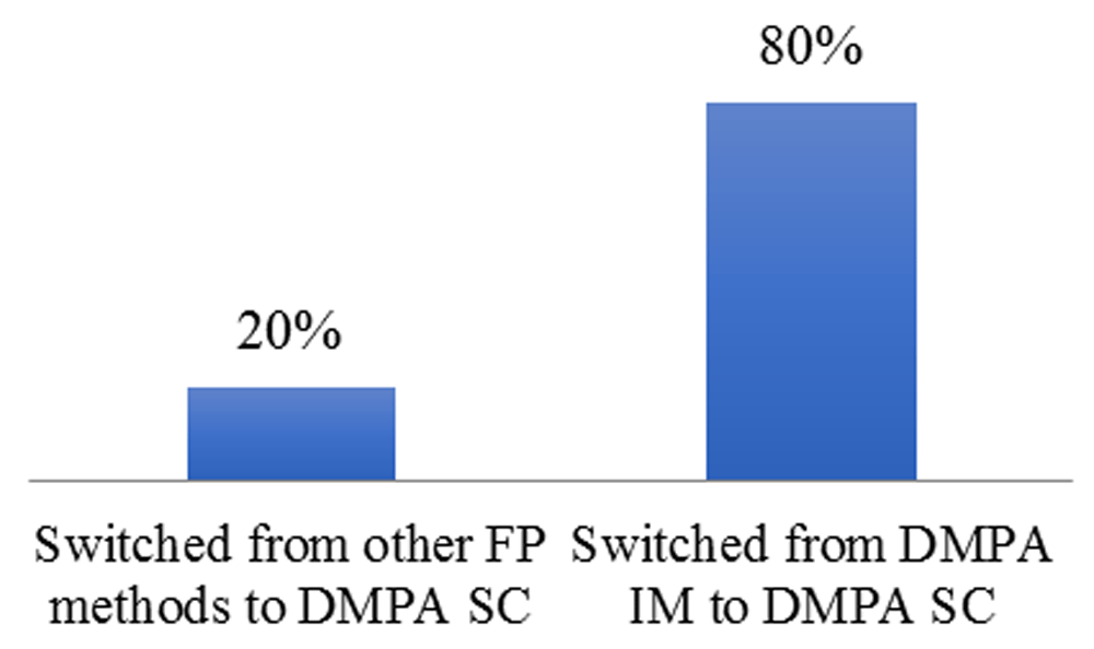 About 80% of FP clients switched from DMPA-IM to DMPA-SC, while 20% of the clients switched from other FP methods to DMPA-SC.