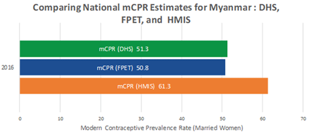DHS is the gold standard method of tracking the family planning program; however, annually tracking the national and subnational progress level for equitable access to family planning services is required. When it was considered the data source for the annual tracking of mCPR, either estimates from FPET or routine service statistics, direct estimates of HMIS were needed to consider carefully to use as it is much higher than the DHS survey and not matched with FPET results except in Chin and Kayin states. It might be due to data quality issue and related with performance of data collectors. Therefore, it should be explored in detail why HMIS shows a high result with 5% annual growth, through reviewing the methodology and validating the data quality.