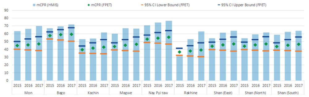 Regarding estimates of modern method use (EMU, comparable to mCPR) from LMIS commodity consumption data, the LMIS data were found to be quite low in comparison to the HMIS and FPET estimates, except in Southern Shan State. For 2017, in Southern Shan State, while there was a >90% reporting rate, EMU from LMIS data were nearly identical to the mCPR of HMIS (63% vs 64%); however, both values are not within 95% CI of FPET estimates.