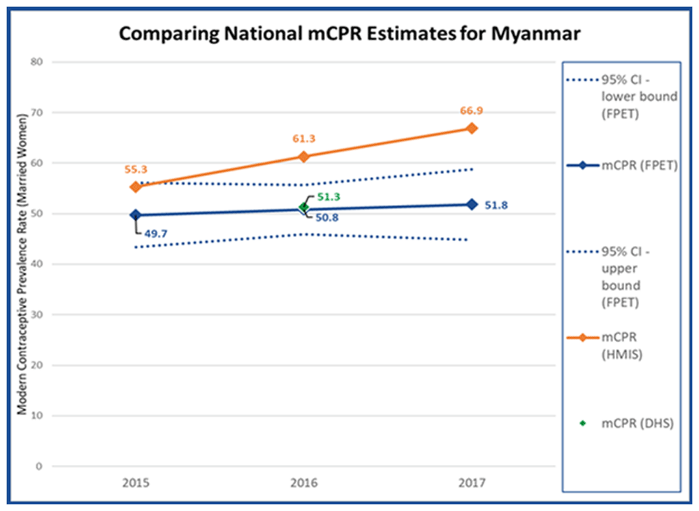 3. mCPR estimates and contraceptive method prevalence from Myanmar’s HMIS system8, based on local annual census conducted by midwives on contraceptive use among married women in their catchment area, and