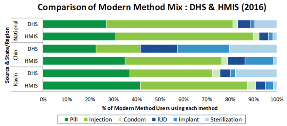 It was observed that there were similar patterns of method mixes at the national level and most of the 17 states/regions, except Chin and Kayin State. In Chin, rates of use of the long-term methods IUD implants, and sterilization were considerably higher than the other areas in DHS data. In HMIS data, only IUD and implant were found as higher proportion than that of other State/Regions. Also in Kayin, the higher use of pills than injections was found only in the DHS, while the injection method was the highest proportion in national and other areas in both DHS and HMIS data.