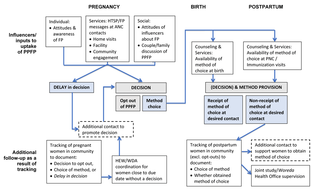 On the client side, intentions to use PPFP may be formed in the antenatal period (Keogh et al., 2015), but are acted upon in the postnatal period. Repeated counseling during ANC and combinations of antenatal and postnatal counseling lead to increased PPFP use (Cleland et al., 2015). Routine health management information systems do not typically facilitate continuity of care (Akashi et al., 2018), however, because data are dispersed across different health care units and facilities. This makes it challenging to link women’s decisions during antenatal counseling with postpartum contraceptive service delivery, especially if providers are unable to access information on services provided previously. Given the many contacts women can have during and after pregnancy at facility and community levels, it becomes difficult for providers to follow women over time and ensure that they are effectively counseled on PPFP, are able to decide about use, and receive their selected method.