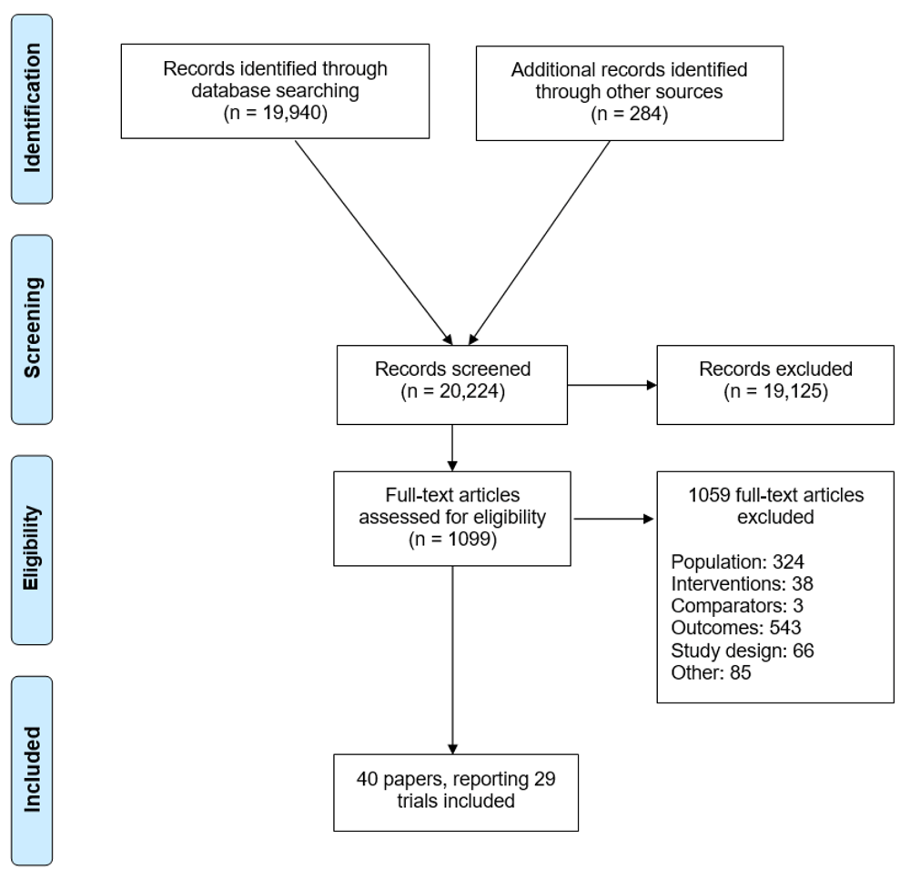 We identified 20,224 abstracts from our database searches and hand searching of reference lists from published reviews (Figure 1). Of these, 1099 studies underwent a full-text review, and 40 papers reporting on 29 trials met our inclusion criteria. In total, these trials pertained to 35,119 participants that were randomized to 73 unique interventions (Figure 2). The list of the final subset is provided in Table 2, and the list of excluded studies (Extended data, Supplementary Table 5)25 is provided in the online appendix.