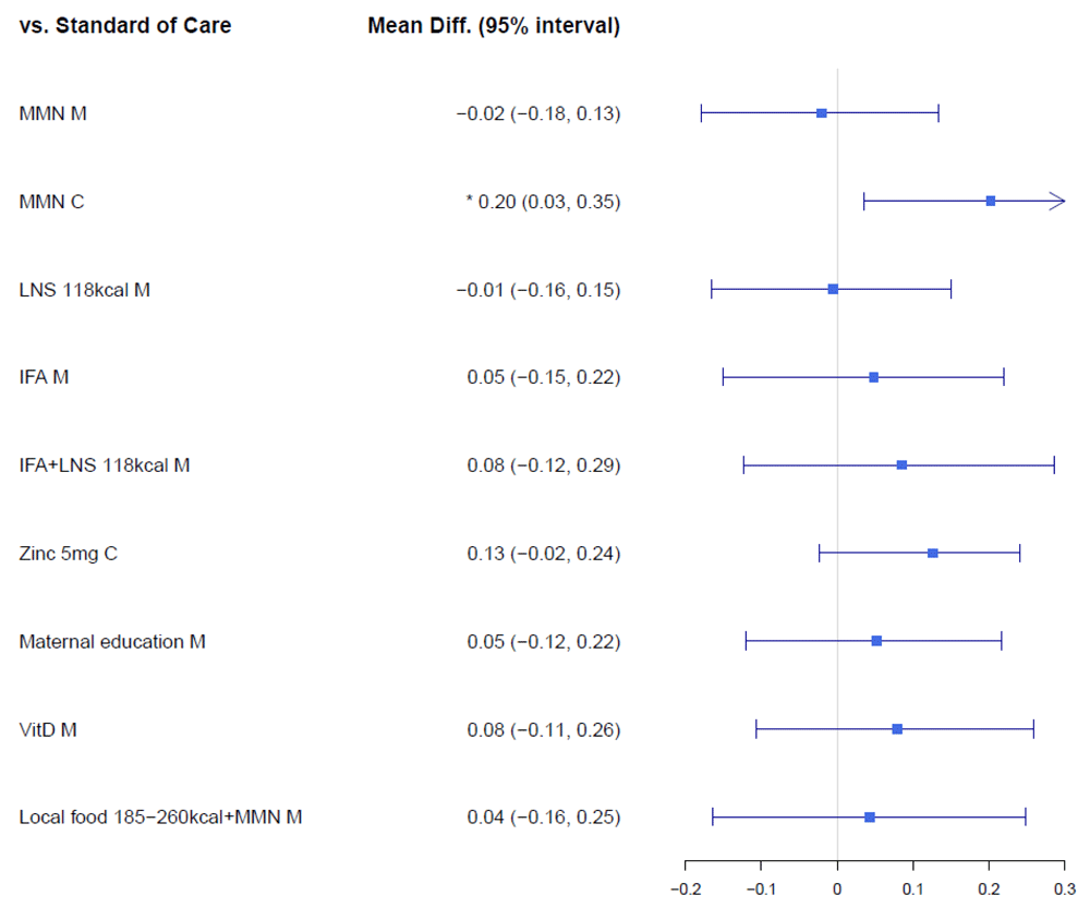 The LAZ network (Extended data, Supplementary Figure 1)25 included 18 trials consisting of 27,896 mother-infant dyads randomized to 52 intervention arms. The results of our primary analysis on LAZ that included both cluster and non-cluster randomized clinical trials are illustrated in Figure 3. Among micronutrient supplements, multiple micronutrients supplementation (MMN) provided to infants improved LAZ relative to standard-of-care (MMN-C, mean difference: 0.20, 95% CrI: 0.03, 0.35), whereas supplementing breasting mothers with MMN did not improve LAZ (MMN-M, mean difference: -0.02, 95% CrI: -0.18, 0.13). Compared to standard of care, other micronutrient supplements to infants, such as zinc 5 mg (zinc 5 mg C) showed a trend towards improved LAZ, but its CrIs overlapped the null of effect of 0.00 (Mean difference: 0.13; 95% CrI: -0.02, 0.24). Also, other micronutrients to breastfeeding mothers, such as iron and folic acid (IFA-M, mean difference: 0.05, 95% CrI: -0.15, 0.22) and vitamin D (Vit D-M: mean difference: 0.08, 95% CrI: -0.11, 0.26), did not improve LAZ in comparison to standard of care. Similarly, both food supplements and maternal education interventions did not improve LAZ; for instance, in comparison to standard-of-care, combination of IFA and 118 kcal of lipid-based nutrient supplements (IFA+LNS 118 kcal-M) showed a mean difference of 0.08 cm (95% CrI: -0.12, 0.29) for LAZ, where maternal education showed a mean difference of 0.05 cm (95% CrI: -0.12, 0.22 cm). No deworming or WASH interventions showed improvements on LAZ.