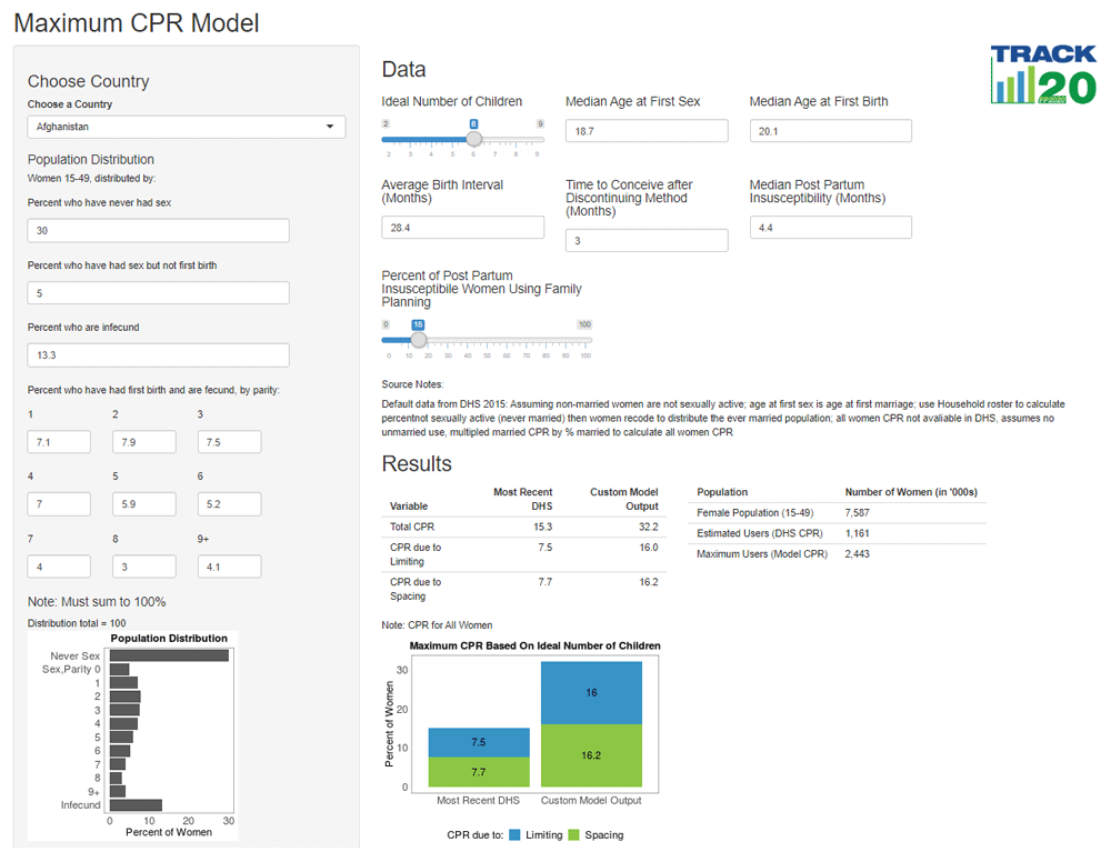 The Maximum CPR Model (MCM) allows demographers, policy makers, and family planning advocates to determine a country’s highest potential contraceptive prevalence rate (CPR), based on an ideal number of children, key demographic life events, and structure of the population. Understanding the highest potential level of CPR achievable under current circumstances in a population leads to realistic expectations and appropriate policy implementation. Countries with a large gap between current CPR and maximum CPR can focus on removing blocks to contraceptive use, while countries where the maximum potential CPR is near the actual CPR may need to shift their focus to demand generation or postpartum family planning programs. With a focus on equality of access to family planning, MCM produces CPR for all women, regardless of marital status. This paper details the mathematical construction of the MCM. A version of the model is available online for easy use by non-technical audiences (Bietsch & Sonneveldt, 2019)1, with default data preloaded from countries’ most recent Demographic and Health Surveys (DHS)2 (Figure 1).