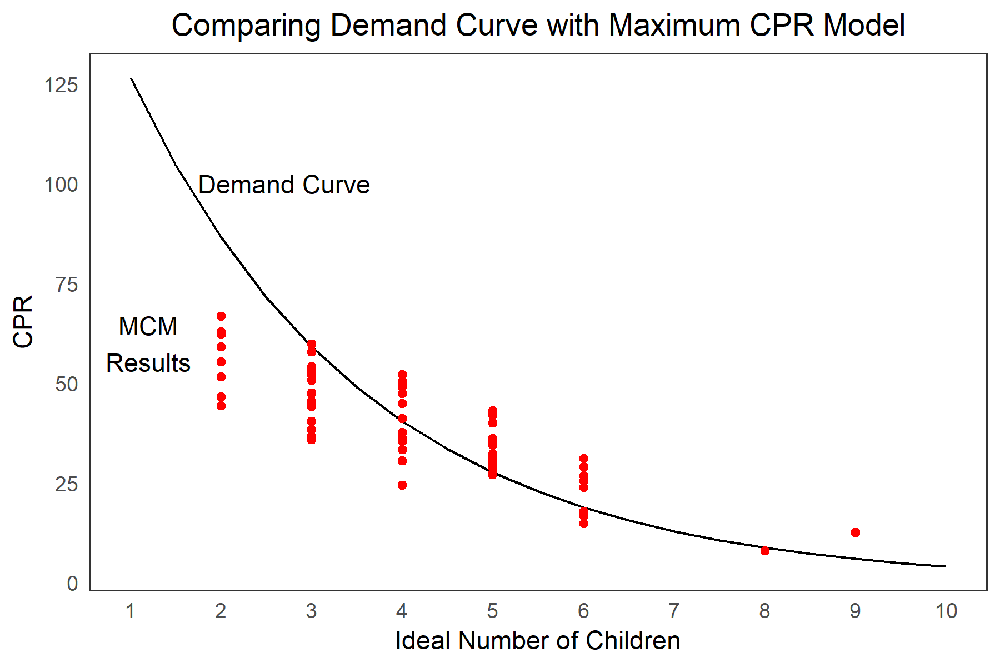 The Demand Curve. The Demand Curve (Weinberger et al., 2017) looks at the ideal number of children and current modern contraceptive use in a country to determine if a country should consider increased investments in access or demand interventions. The Demand Curve is an equation calculated off the highest CPR witnessed in countries at give ideal number of children. We have conducted a comparison between the MCM with default data from recent DHS and Demand Curve, and present results in Figure 2.