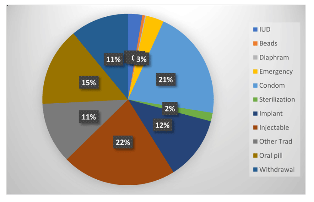 The method mix of the respondents and percentage distribution is shown in Figure 1. Respondents included those who were married to or living with a man at the time of the survey and were currently using contraception.