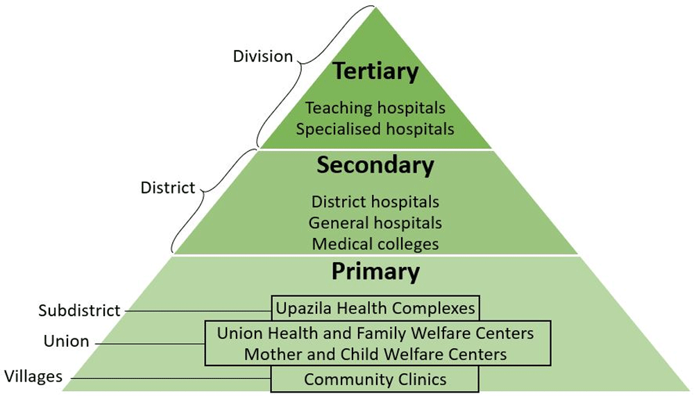 Bangladesh has signed to the Alma-Ata Declaration and included the primary health care approach in the nation’s First Five Year Plan (1972–1978). It implemented this Declaration by establishing Upazila Health Complexes (WHO, 2008; WHO, 2015b). Bangladesh has a decentralised health care system (see Figure 1) in order to make services available to everyone (Kouam et al., 2014; WHO, 2015b). The primary health care system in Bangladesh consists of: Upazila Health Complexes, Union Health and Family Welfare Centers and Community Clinics (Kouam et al., 2014; WHO, 2015b). This decentralised system is seen as efficient because the facilities are the first point of contact for rural communities and they cover the entire spectrum of health care services. These facilities often fulfil similar roles to District Hospitals (Abbas & Routray, 2013). Studies in Bangladesh and elsewhere have also confirmed the vital role that primary health care facilities play during floods (Abbas & Routray, 2013), as well as in reducing mortality and morbidity in order to meet the nation’s target for Millennium Development Goal 5 through the provision of family planning services, contraception and basic essential health care services (El Arifeen et al., 2014; Gideon et al., 2015; WHO, 2015b).