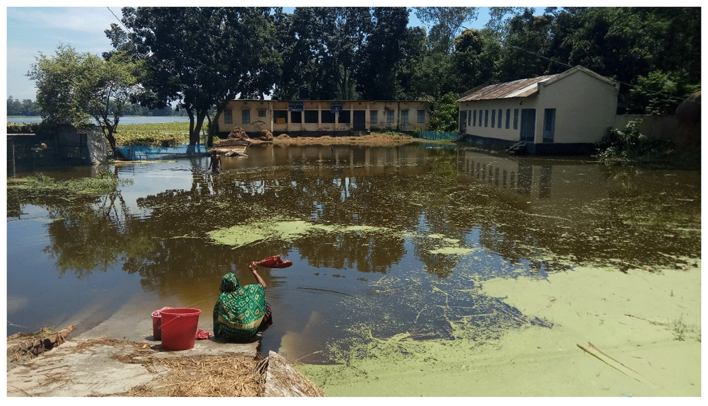 Shortage of medicines and equipment: The facility assessments revealed that the capacity of the Belkuchi Upazila Health Complex has been expanded to accommodate 50 indoor beds (from 31 beds) due to the addition of a new building (inaugurated in July 2017). Within Belkuchi, the only emergency obstetric care trained personnel were four nurses at the Upazila Health Complex. The Upazila Health Complex provided a number of family planning measures such as oral contraceptive pills, condoms, intra uterine devices, injections, implants and the emergency contraceptive pill. The supply of all Misoprostol medicines was withheld for the previous three months for unknown reasons. Of the 31 important pieces of equipment related to menstrual regulation and post-abortion care services (see OSF for the list of equipment/resources assessed by the structured assessment tool (Ray-Bennett et al., 2019)), the Upazila Health Complex was rated 84% equipped and the Union Health and Family Welfare Centers in Bhangabari were rated 70.9%, Daulatpur 67.7%, Rajapur 67.7%, Dhukuriabera 45.2% and Bordhul 19.4%. The operating theatre lights were not functioning both at the Upazila Health Complex and at the Rajapur Union Health and Family Welfare Center during the time of the assessments. General counselling was provided at the Upazila Health Complex and the five Union Health and Family Welfare Centers. Post menstrual regulation/post-abortion contraceptive counselling was available in all the facilities, except in Bordhul. All the facilities were physically vulnerable to floods (for instance, see Figure 2).