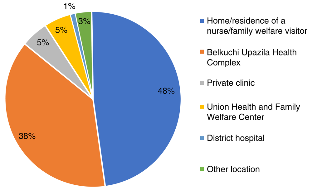 Women’s care-seeking patterns. Only 66 participants out of the 370 answered the question: ‘Where did you receive the healthcare services for your most recent menstrual regulation?’ The majority of the participants (48.48%) received the menstrual regulation from the home/residence of a Nurse or Female Welfare Visitor, followed by 37.88% from Belkuchi Upazila Health Complex, 4.55% from a Private Clinic, 4.55% from a Union Health and Family Welfare Center, 3.03% from ‘Other’ location and 1.52% from the District Hospital (see Figure 3).