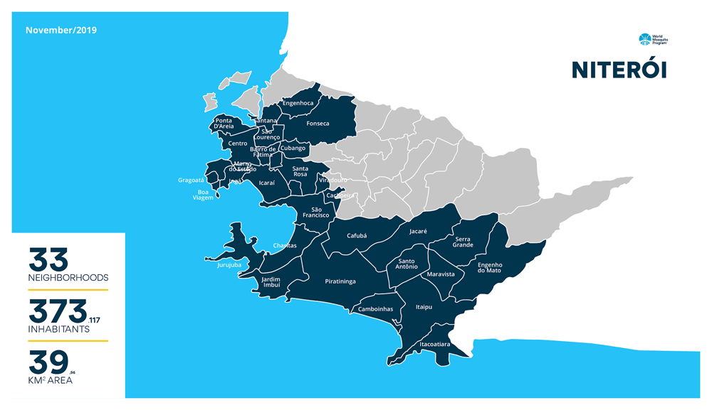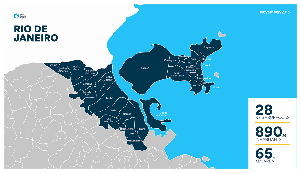 Studies conducted by different groups20–26 indicate that Ae. aegypti that carry Wolbachia have a reduced ability to transmit these viruses to people, decreasing the risk of outbreaks of these arboviruses. Once mosquitoes with Wolbachia are released into the environment, they breed with field mosquitoes, and consequently, the prevalence of Wolbachia-positive mosquitoes increases and tends to become stable. Currently, the WMP operates in 12 countries, including Brazil, where releases of Aedes aegypti mosquitoes with Wolbachia have occurred since 2014 in the municipalities of Rio de Janeiro (RJ) and Niterói (RJ). After a pilot phase, the project has expanded its activities since 2016 and, by the end of 2019, it has reached an area of 105 km2, which covers 1,263,878 inhabitants (Figure 2 and Figure 3).