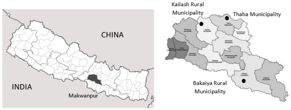 The study is being conducted in three Palikas (equivalent to a municipality) of the Makwanpur District of Nepal: Thaha Municipality, Kailash Rural Municipality and Bakaiya Rural Municipality (see Figure 1). As per the NIP schedule, the rate of immunization coverage of children under one year in Makwanpur is 76.7% (Ministry of Health Nepal Department of Health Services, 2018). Furthermore, Makwanpur is accessible from Kathmandu, the capital of Nepal, is neither in the lowlands (Terai) or mountainous regions, and is large in size. These features make Makwanpur an ideal candidate setting to maximize feasibility and external validity as well as minimize contamination.