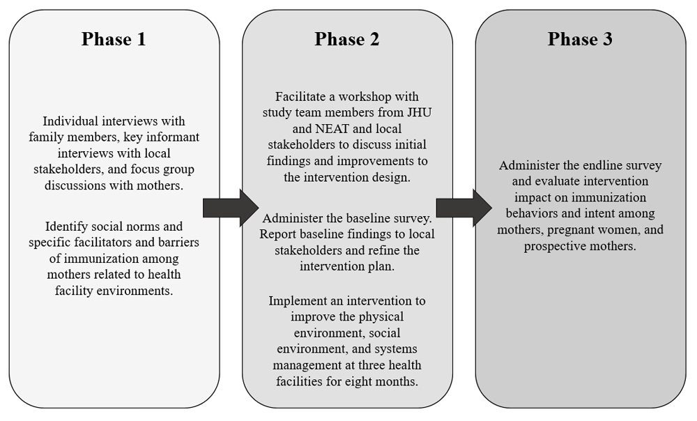 This study is composed of three phases: 1) qualitative formative assessment, 2) intervention implementation, and 3) quantitative impact assessment (see Figure 2). Mixed methods approaches can be useful for producing a more comprehensive picture of the issue at hand and building on initial findings (Denscombe, 2008). For this study, the formative assessment will be used to understand individual and group perspectives of immunization practices in their communities and opinions about their local health facilities. The findings from this assessment will be used to build on the Rejoice Architecture intervention plan, which will include improvements to the health facility through three basic components: 1) physical environment and infrastructure, 2) social environment and communication with health staff, and 3) systems management and scheduling. Specific intervention activities will include painting walls, providing furniture, adding greenery, designing a client-provider communication checklist, and implementing an appointment reminder system, among others. Activities will be refined, expanded upon, or added based on priorities identified in the formative assessment. Following this assessment, a clustered quasi-experimental survey design will be utilized to determine overall impact of the intervention.