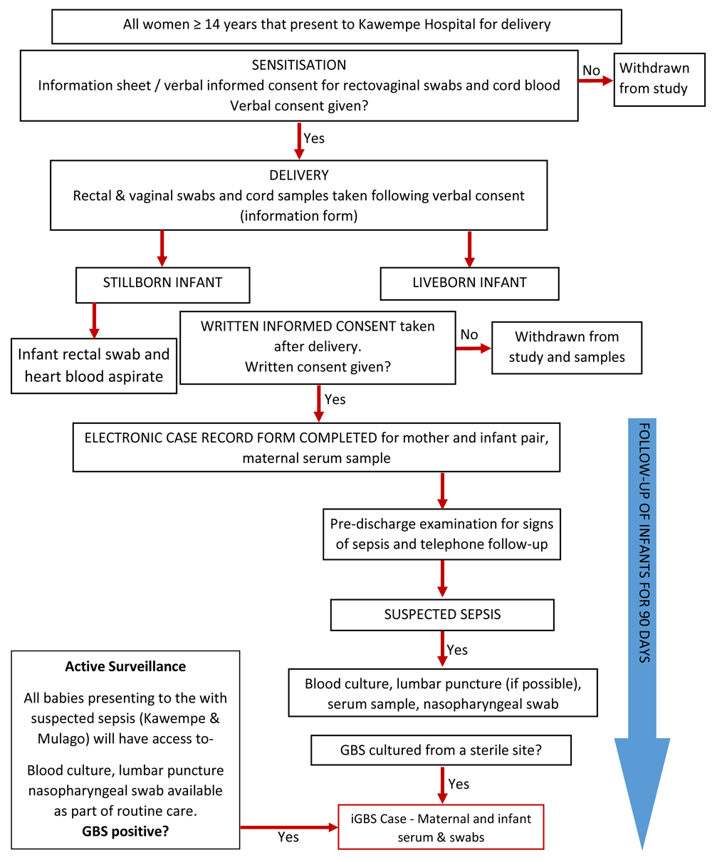 The study has two entry points, women and their infants consenting at birth (birth cohort), and any infant with signs of infection presenting before they are 3 months old (active surveillance cohort).