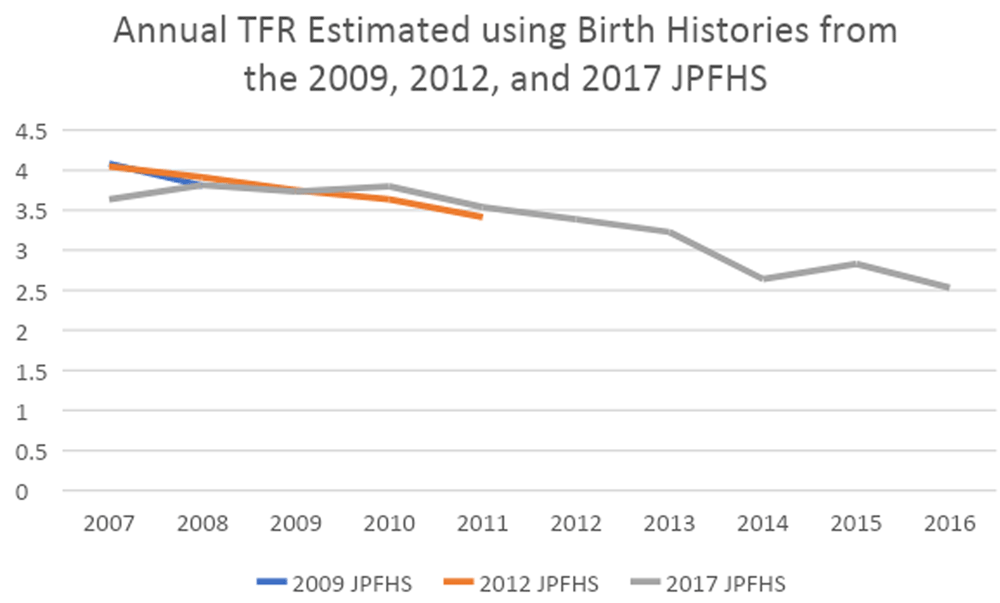 Internal validation of the JPFHS. As shown in Figure 1, we find no evidence to support the hypothesis that the reported rapid decline in TFR is due to an undercounting of births in the most recent survey. As can be seen below, except for the 2007 calculated from the 2017 survey, the TFRs are consistent. Looking at TFRs from the 2017 survey, fertility decline began around 2010 (though the older surveys show a decline from at least 2007), and a major decline in TFR happened between 2013 and 2014; there was a small bounce back in 2015, but then a decline in 2016 to the same level as 2014.