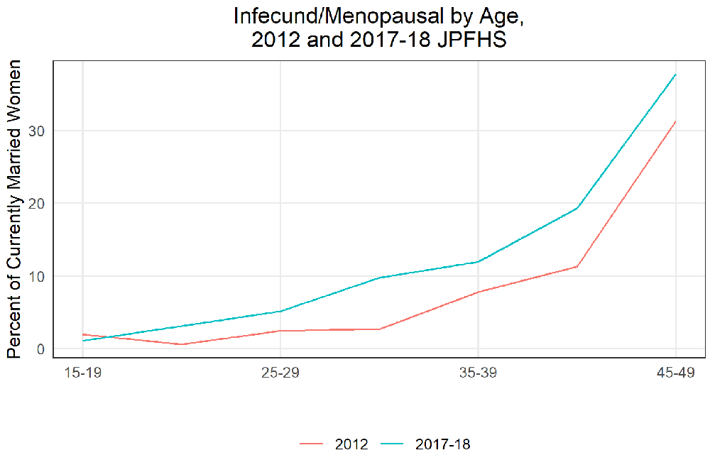 Marriage and exposure to risk of pregnancy Overall, 56.0% of women of reproductive age in the households interviewed by JPFHS were currently married in the 2017–18 survey, compared to 54.2% in 2012, though this increase is not statistically significant. The mean age of married women rose from 34.4 to 34.7, the largest change by age group was 45–49-year-old women, who increased as a share of married women from 12.8 to 15.8% (a statistically significant increase). At the same time, Table 9 shows that more women were likely to have been married for under two years in 2017 compared to 2012, 8.9% compared to 6.9% (statistically significant), while the percent who had been married for 2–4 years declined from 13.0% in 2012 to 11.7% in 2017–18 (not statistically significant). This postponement in marriage and change in marital distribution may explain some of the reasons for the drop in current contraceptive use. The higher proportion of women of reproductive age that were recently married could impact the contraceptive rate, because they may want to have their first child soon and may not have been using contraceptives during the period of the survey (less than 1% of nulliparous women reported using modern contraception in either the 2012 or 2017 JPFHS). Also, these women would not have been married during a large part of the 3-year windows used to construct total fertility rates.