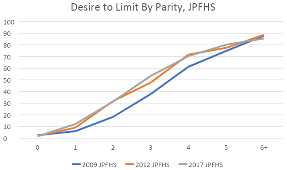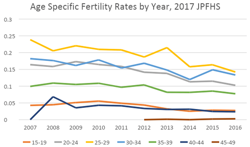 Figure 2 shows that the drop from 2013–14 happened for the three highest fertility age groups- women ages 20–34. The drop in the three groups in 2014 is followed by one year of growth or stagnation, then a decline between 2015 and 2016 for the four age groups with the highest age specific fertility rates. There does not appear to be a data quality issue in underreporting of births in the 2017 JPFHS in comparison to earlier surveys. Fertility was falling by 2010, and may have started earlier, with a rapid decline between 2013 and 2014.