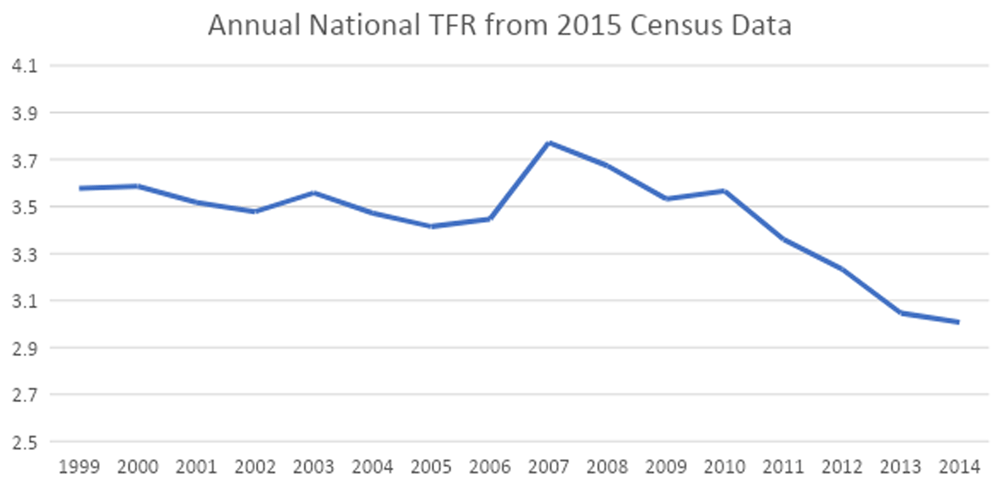 To look at more recent declines, we calculate annual estimates for CBR and GFR (Table 2) and see continuous monotonic declines for both measures from 2007 to 2016, with the largest declines between 2012-2013. There are small increases in CBR and GFR between 2016 and 2017, though in 2018 the CBR and GFR declined to the same level as 2016.