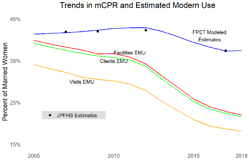 To externally validate the trend in contraceptive use between JPFHS surveys, we construct an annual estimated modern use (EMU) value using data from the Ministry of Health Contraceptive Logistic Management Information System. EMU is a measure developed by the Track20 project as part of the monitoring process supporting the FP2020 global initiative to facilitate annual estimates of modern contraceptive use based on service statistics. The tool used to generate the EMU value uses government data on contraceptive distribution, making several adjustments for long term methods distributed in years prior that may still be in use in the current year, method discontinuation, and lack of data from certain private sources (especially pharmacies and shops)14. Data from 2005 to 2018 for commodities distributed to clients, commodities distributed to facilities, and family planning visits were all available for the majority of public sector and minority of private sector distribution. These variables are collected to monitor the distribution and dispensing of family planning commodities and to report to the MOH indicators related to couple years of protection (CYP) and family planning visits. Each facility receiving commodities from the MOH must report to the central MOH at the end of each month in paper format. Staff at the central level enter the data into the logistics information system. This system generates indicators including those related to stockouts. In order to use the EMU to validate the latest JPFHS mCPR estimate, we run the Family Planning Estimation Tool (FPET) with the EMU value calculated from commodities to clients data (which allows FPET to consider the service statistics data in its estimate calculations) and excluded the 2017 survey. The FPET is part of joint work by Track20, the United Nations Population Division, and UMass Amherst to estimate and project likely paths of CPR, mCPR and unmet need. It is the official tool used in tracking progress for the FP2020 Global Initiative15.