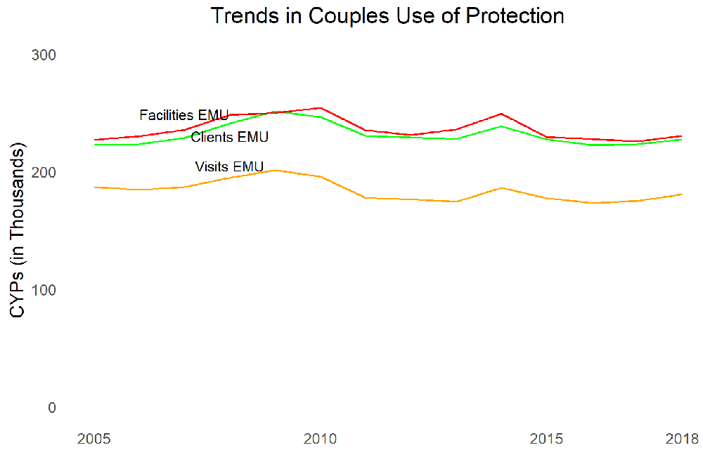 The EMUs show adjusted CYPs with a denominator of women of reproductive age. If we look at the CYPs without adjustment (Figure 5), we see almost flat distribution in all three datasets. Over the same period, the number of women of reproductive age grew by 73%. A similar number of contraceptive commodities, delivered to a growing population, results in a decline of mCPR.